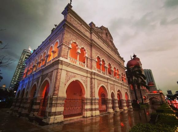 Fronting Jalan Raja and the Royal Selangor Club, the building is the showpiece of KL’s historic core. Its Indo-Saracenic / Neo-Mughal vocabulary—striped “blood-and-bandage” brickwork, scalloped arches, and bulbous copper domes—culminates in a 41-metre clocktower that chimes the hour. The long façade runs more than 130 m, creating one of the city’s most photogenic skylines.